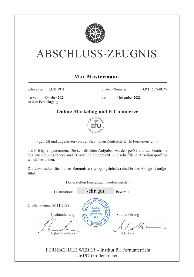 Entsprechend den Ergebnissen der Abschlussprüfung und unter Berücksichtigung der für die Hausaufgaben erteilten Noten wird Ihnen dann das Fachlehrgangszeugnis der Fernschule Weber erteilt, das als Leistungs- und Fortbildungsnachweis dient.