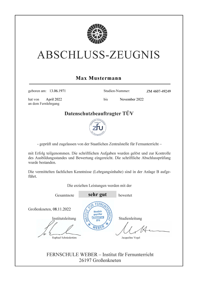 Nach erfolgreicher Beendigung des Fernlehrgangs sind Sie berechtigt, bei der TÜV® NORD Akademie oder einer Partnerakademie in der Bundesrepublik Deutschland die Prüfung zum „Datenschutzbeauftragten (TÜV®)” abzulegen und das entsprechende TÜV®-Zertifikat zu erlangen.
