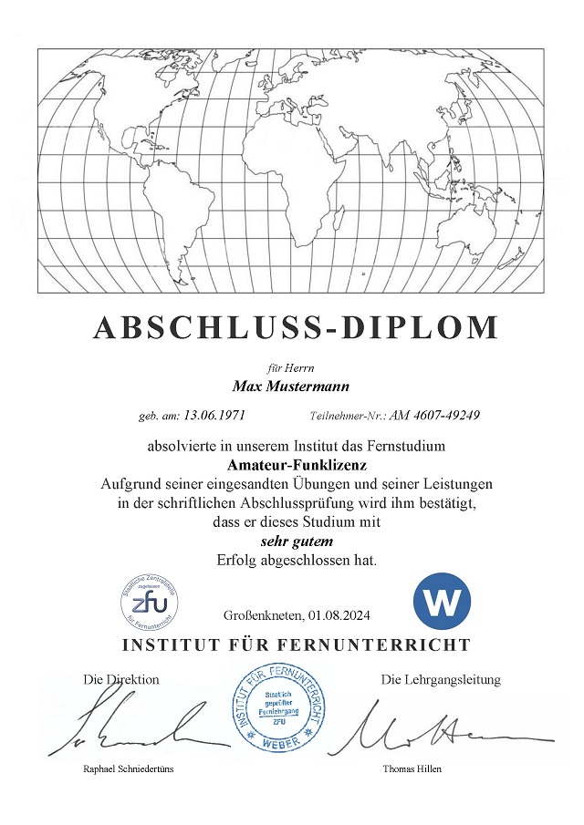 Entsprechend den Ergebnissen der Abschlussprüfung und unter Berücksichtigung der für die Hausaufgaben erteilten Noten wird Ihnen dann das Abschlussdiplom der Fernschule Weber erteilt, das als Leistungs- und Fortbildungsnachweis dient.