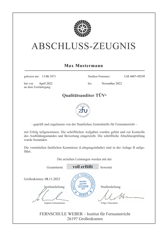 Nach erfolgreicher Beendigung des Fernlehrgangs und Erfüllung der Prüfungsvoraussetzungen sind Sie berechtigt, bei der TÜV® NORD Akademie oder einer Partnerakademie in der Bundesrepublik Deutschland die Prüfung zum „Qualitätsauditor (TÜV®)” abzulegen und das entsprechende TÜV®-Zertifikat zu erlangen.