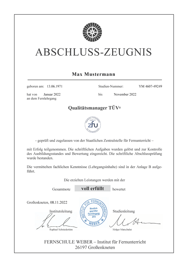 Nach erfolgreicher Beendigung des Fernlehrgangs und Erfüllung der Prüfungsvoraussetzungen sind Sie berechtigt, bei der TÜV® NORD Akademie oder einer Partnerakademie in der Bundesrepublik Deutschland die Prüfung zum „Qualitätsmanager (TÜV®)” abzulegen und das entsprechende TÜV®-Zertifikat zu erlangen.